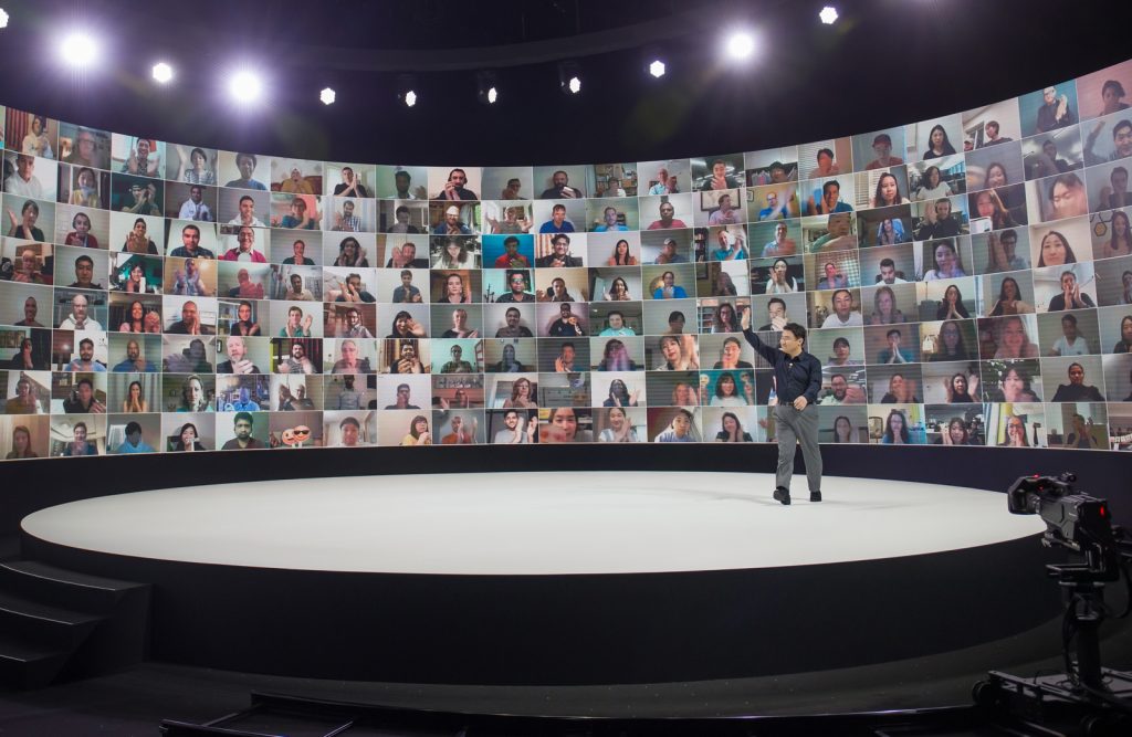The studio also includes (smaller) physical screens so that the presenter can see the audience and presentation notes and speaks for real audiences.